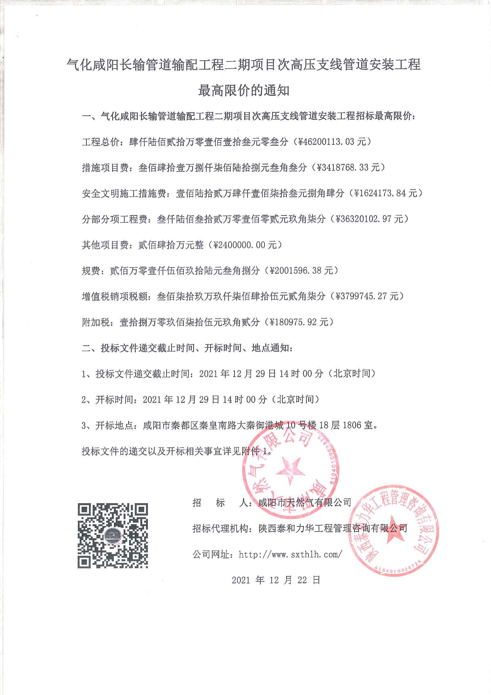 气化咸阳长输管道输配工程二期项目次高压支线管道安装工程最高限价的通知
