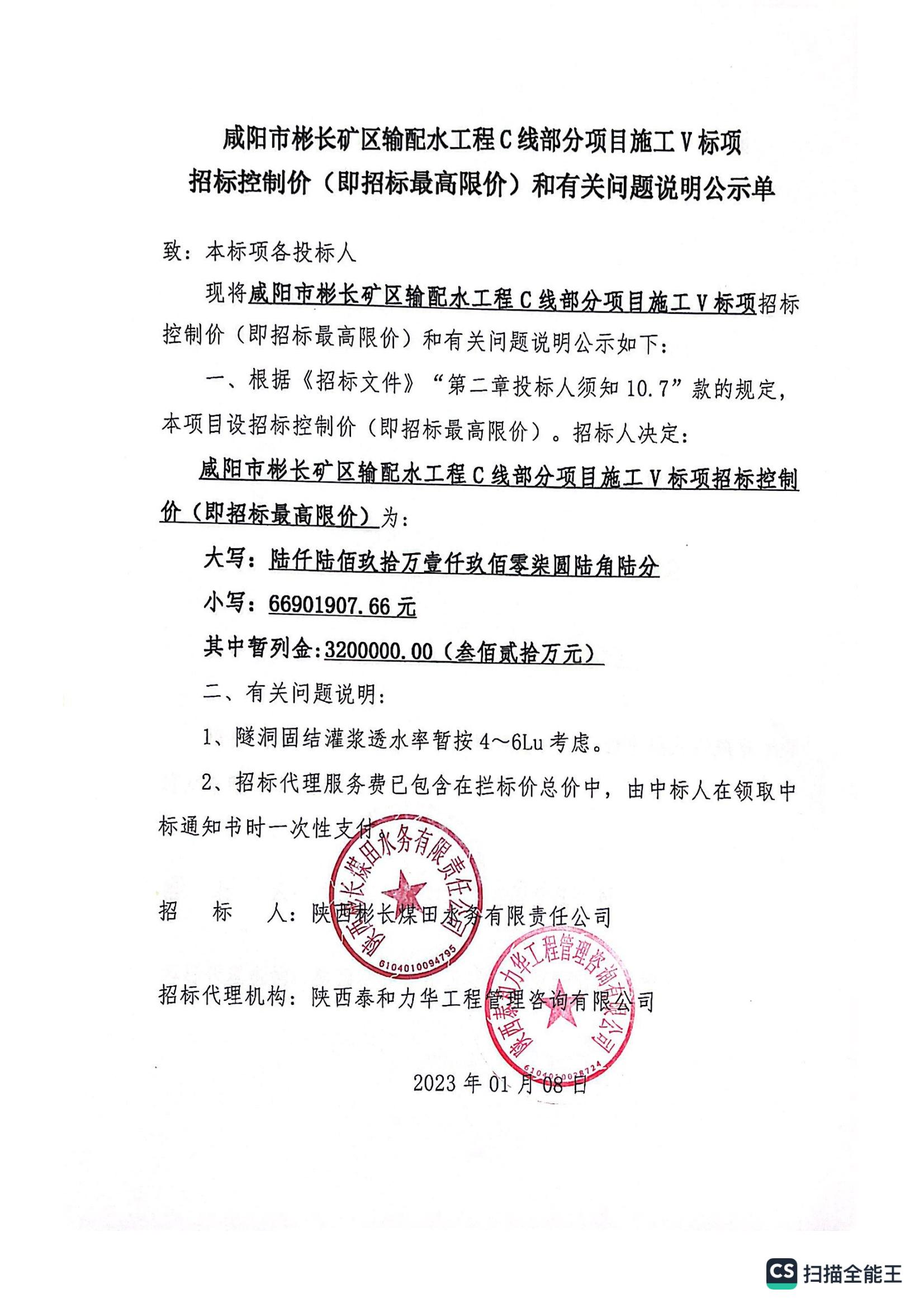 咸阳市彬长矿区输配水工程C线部分项目施工V标项招标控制价(即招标最高限价)和有关问题说明公示单