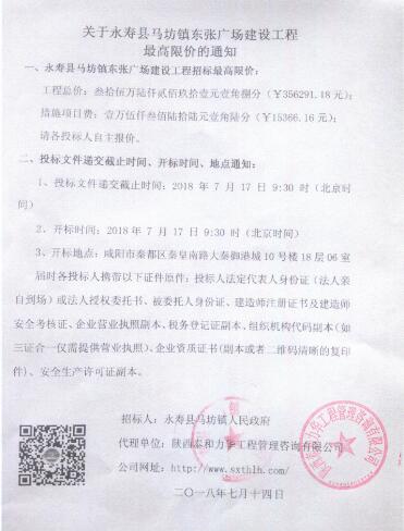 关于永寿县马坊镇东张广场建设工程最高限价的通知