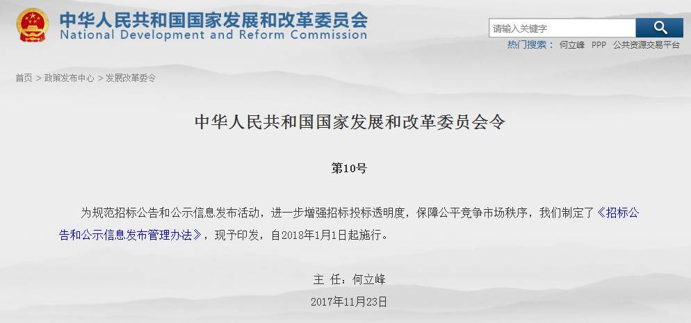 发改委印发《招标公告和公示信息发布管理办法》,2018年1月1日起施行!